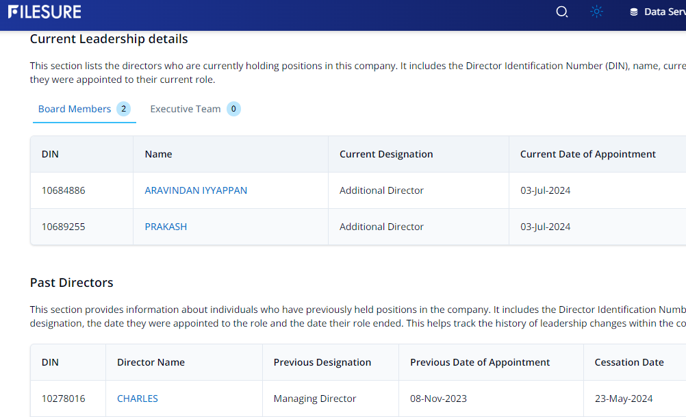 Understanding the history of a company’s leadership is essential for making informed business decisions. On Filesure.in, we differentiate between current and past directors to give you a clear picture of a company’s governance over time shown in the below image.