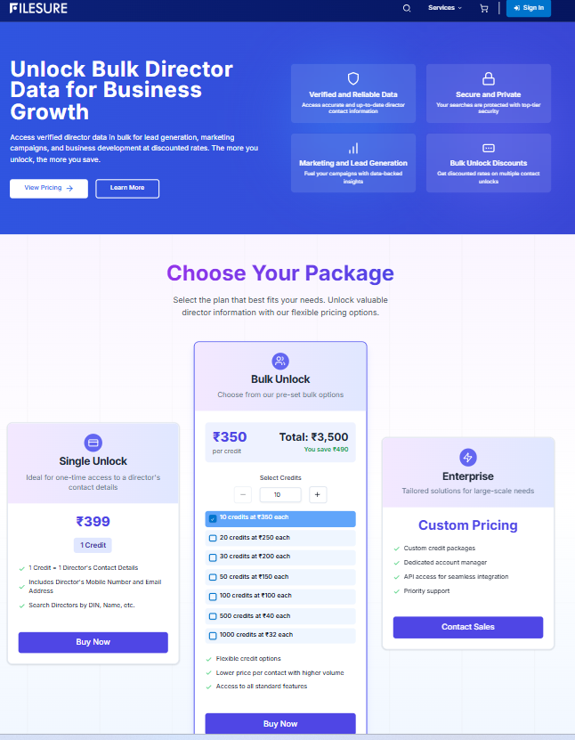 FileSure is an online business intelligence platform designed to give instant access to Indian company & director data. It simplifies how users search, analyze & unlock bulk director data in India.