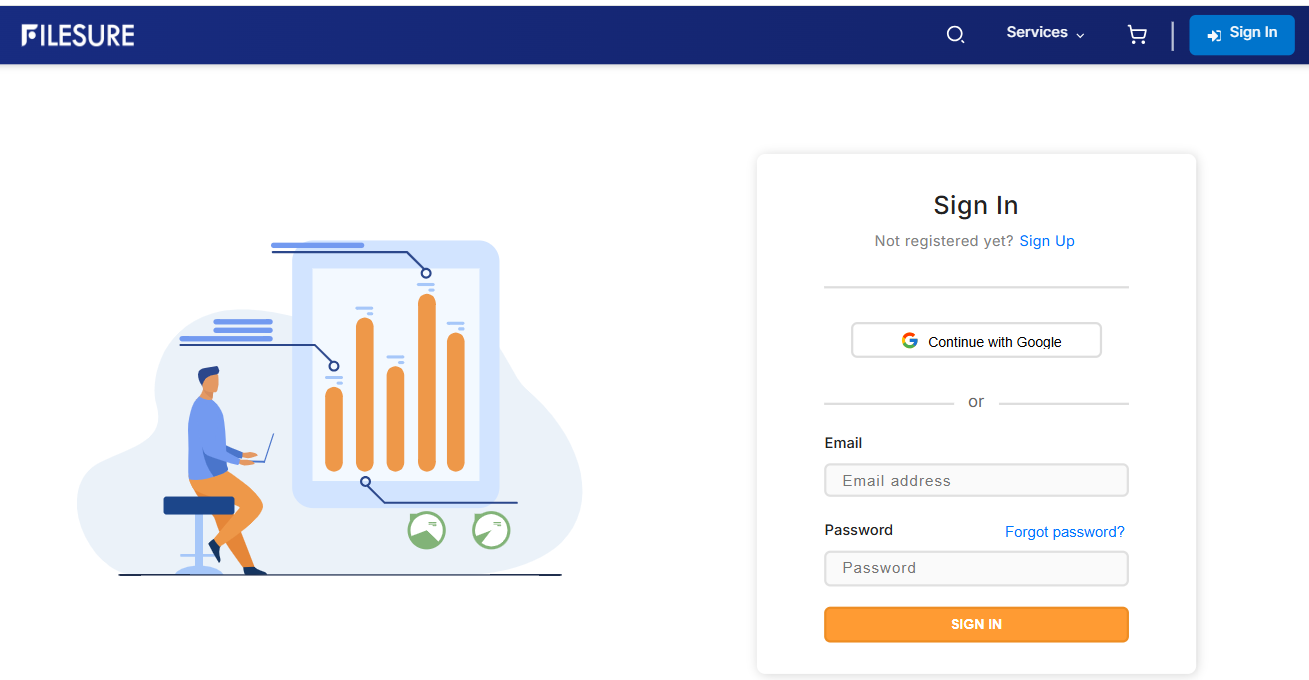 The users start by visiting the FileSure platform & completing sign-up. We see the registration process stays simple & quick. The dashboard provides clear access to search options.