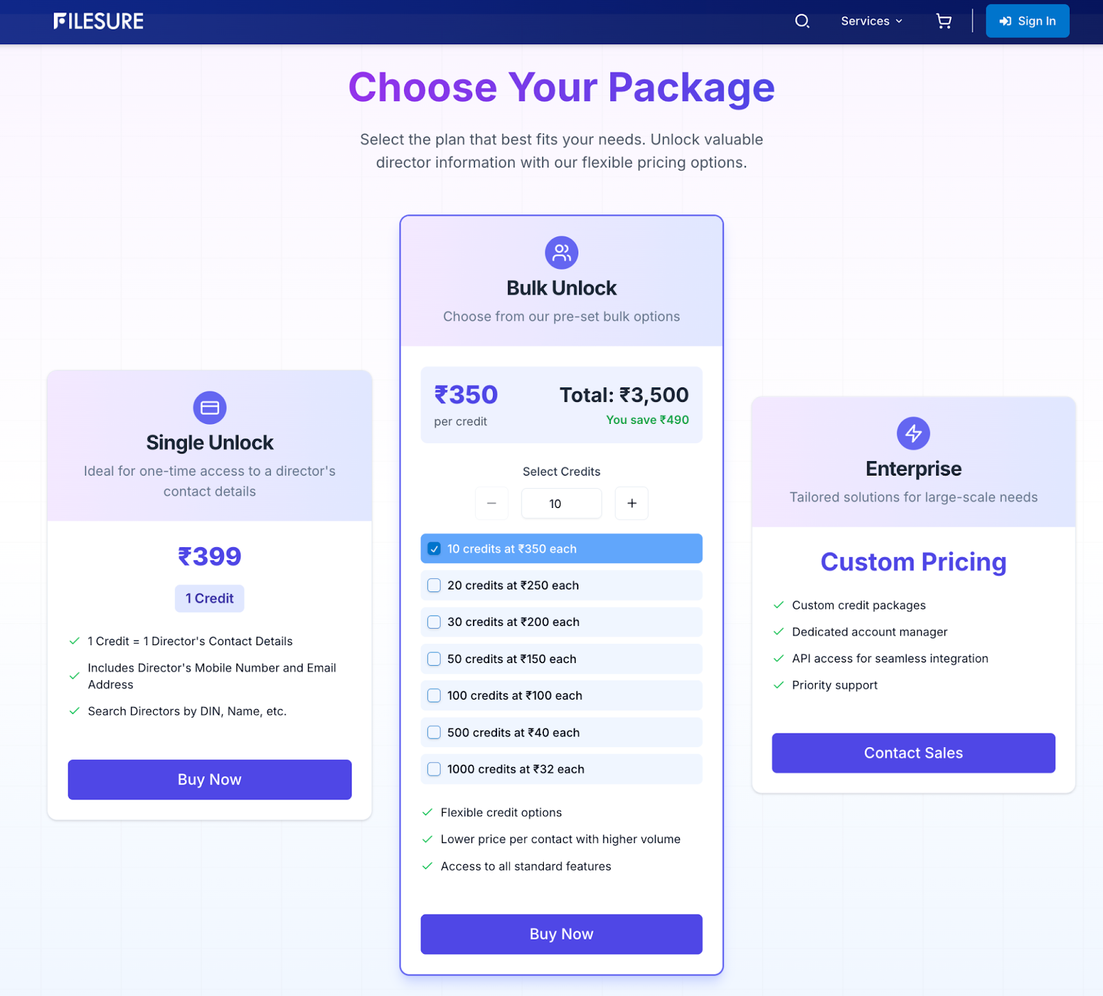 The Filesure Contact Database is a B2B intelligence platform that helps users find verified director-level contact details of Indian companies using official public records. It enables searches by company name, CIN, or director name to access company profiles, leadership information, compliance status, and available email and mobile details.
