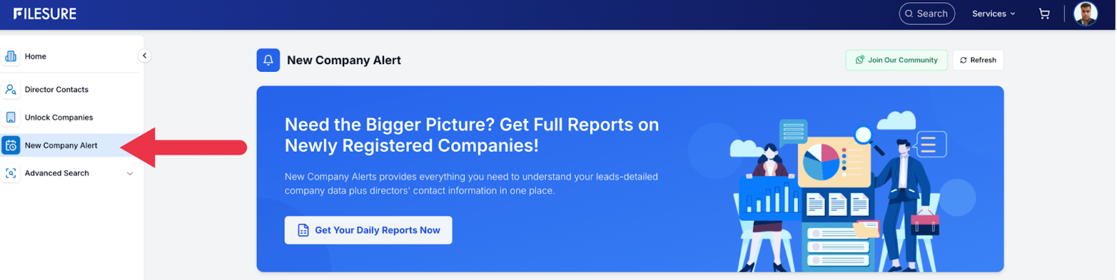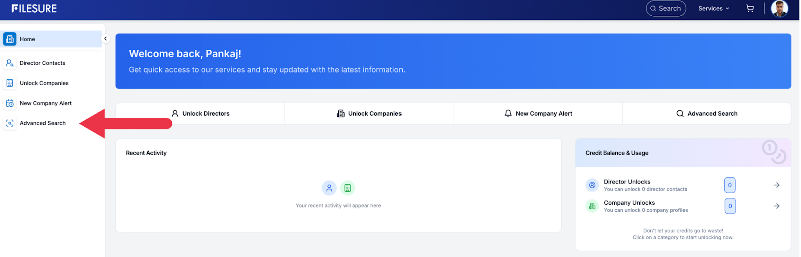 The FileSure Dashboard is your personalized workspace designed to give you instant access to key services and account insights. From unlocking directors and companies to tracking recent activity and monitoring credit balance, everything is organized in one clean interface. With quick navigation options like Advanced Search, New Company Alerts, and service shortcuts, the dashboard ensures you can manage research, compliance checks, and data access efficiently from a single screen.