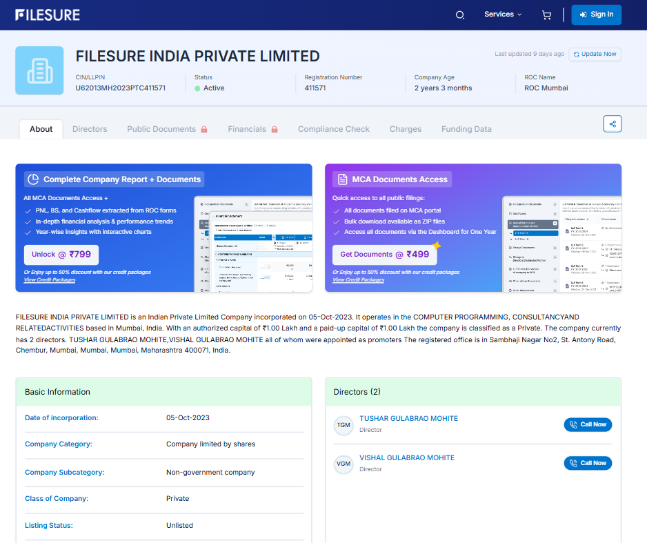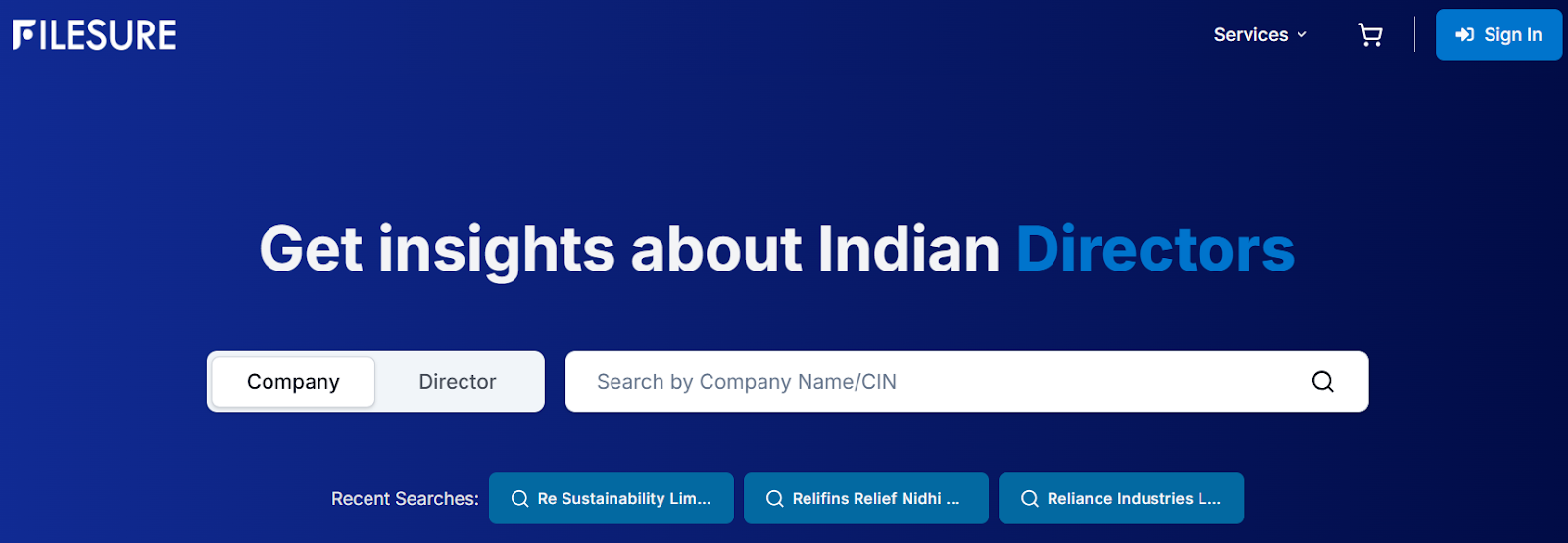 The Filesure provides deep insights into Indian companies registered under MCA & related frameworks. The users can search companies using name or CIN & get instant access to key business details: