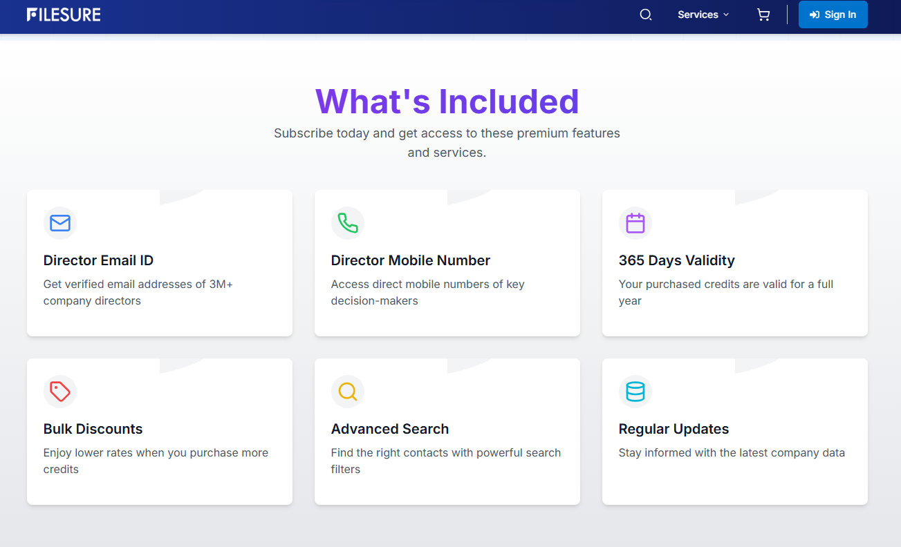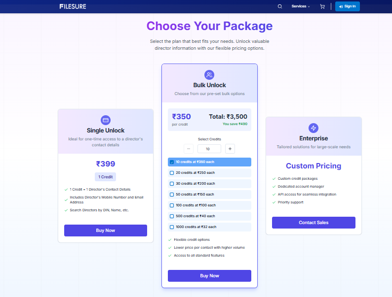 Instead of buying full databases, you pay only per contact. This makes outreach simple and budget-friendly. If you want to understand how FileSure credits work for the director contact, this guide explains everything clearly.