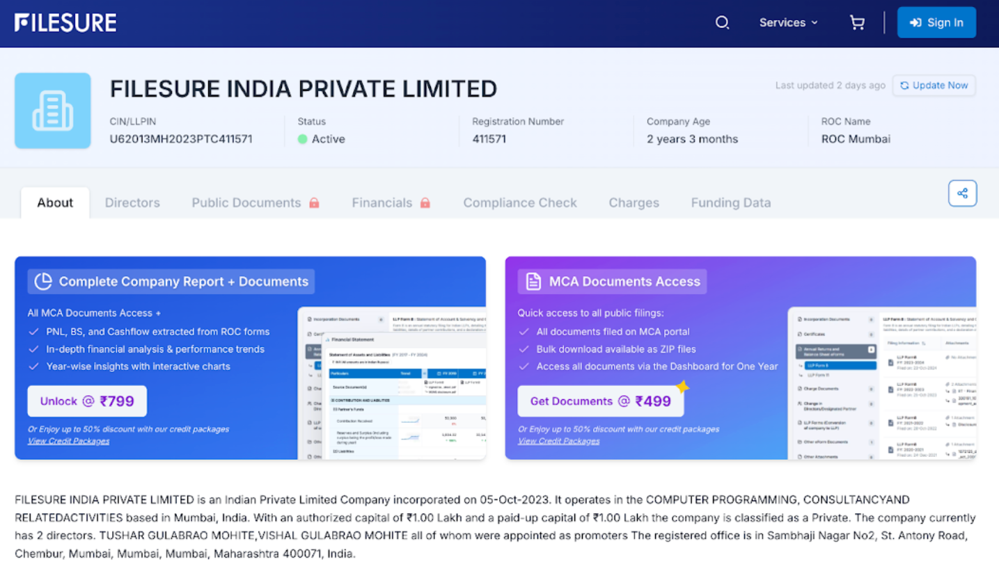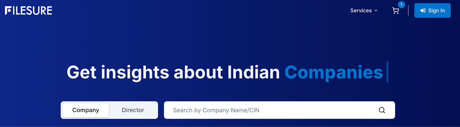 The FileSure platform provides Indian company & director insights using a simple search system. We see the platform collect, organize & display business information in an easy format for users.
