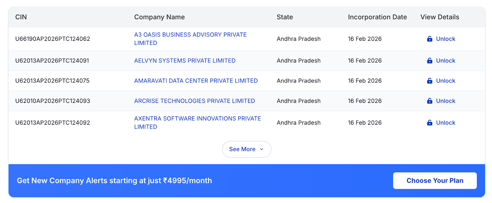 Newly registered company names and CIN