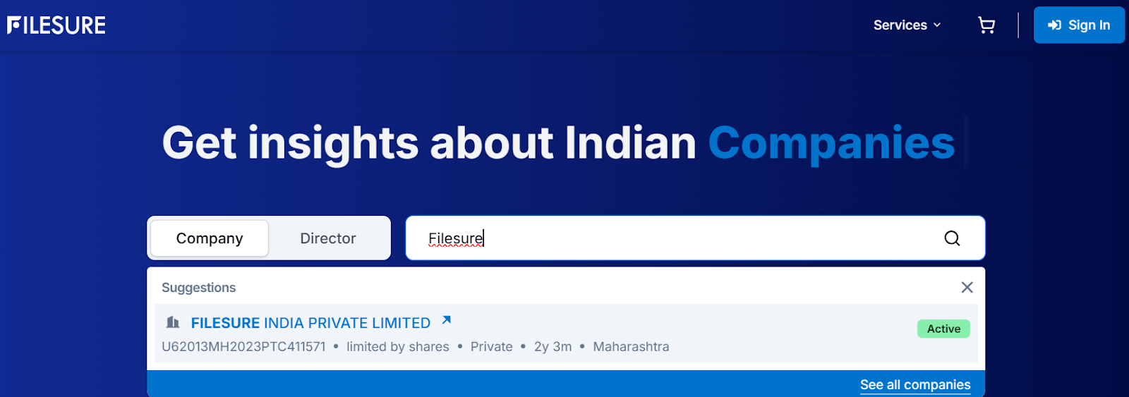 The users enter a company name or CIN in the search field & receive matching results instantly. They select the correct profile to avoid confusion between similar company names.