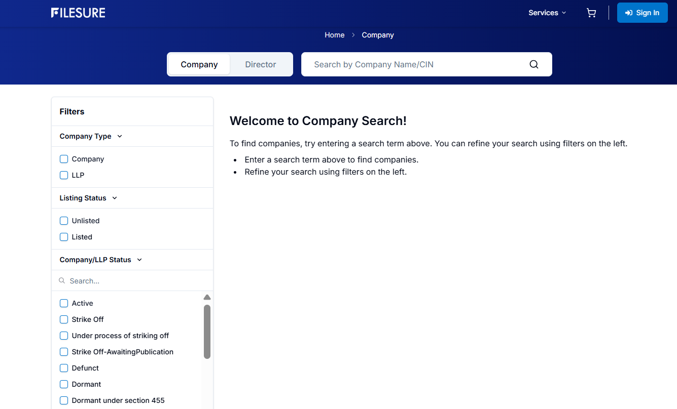 Select the Entity Type filter (Company or LLP) to get correct results.