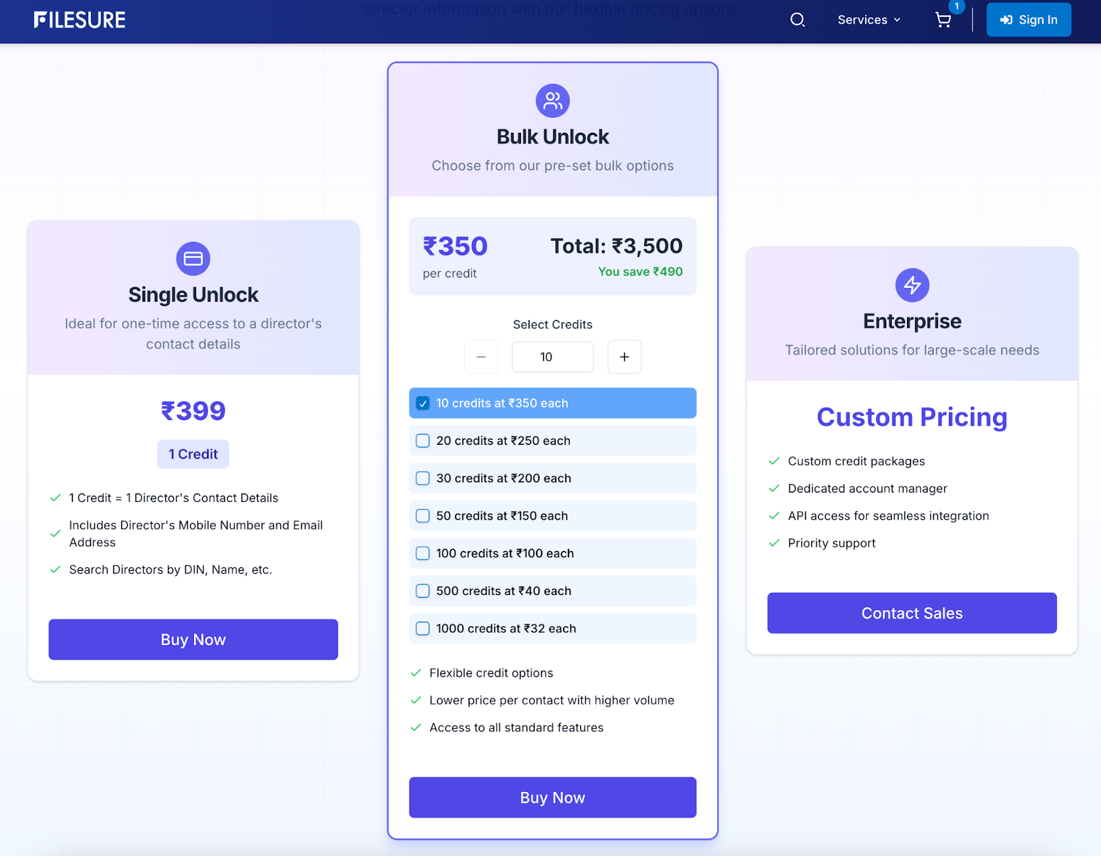 The platform offers bulk unlock options for large data needs.