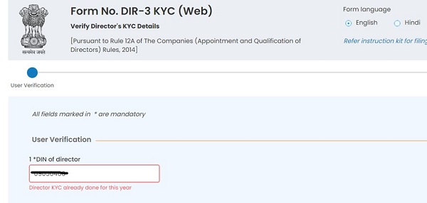 The first method is the DIR 3 KYC form. The DIR 3 KYC form is needed when a DIN holder files KYC for the first time or when any detail is updated. The form needs a DSC & a professional certificate by a CA, CS or CMA.