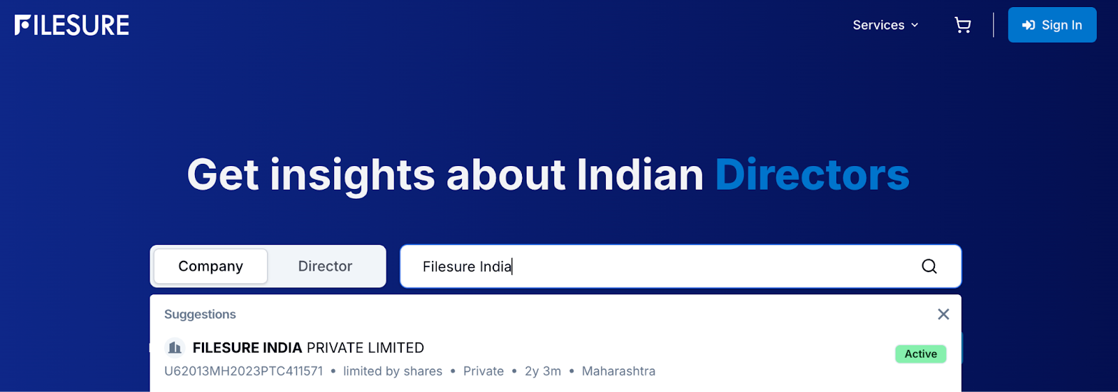 The users start by visiting the Filesure platform & selecting the company search option. The company name or CIN entry displays structured company profiles instantly.